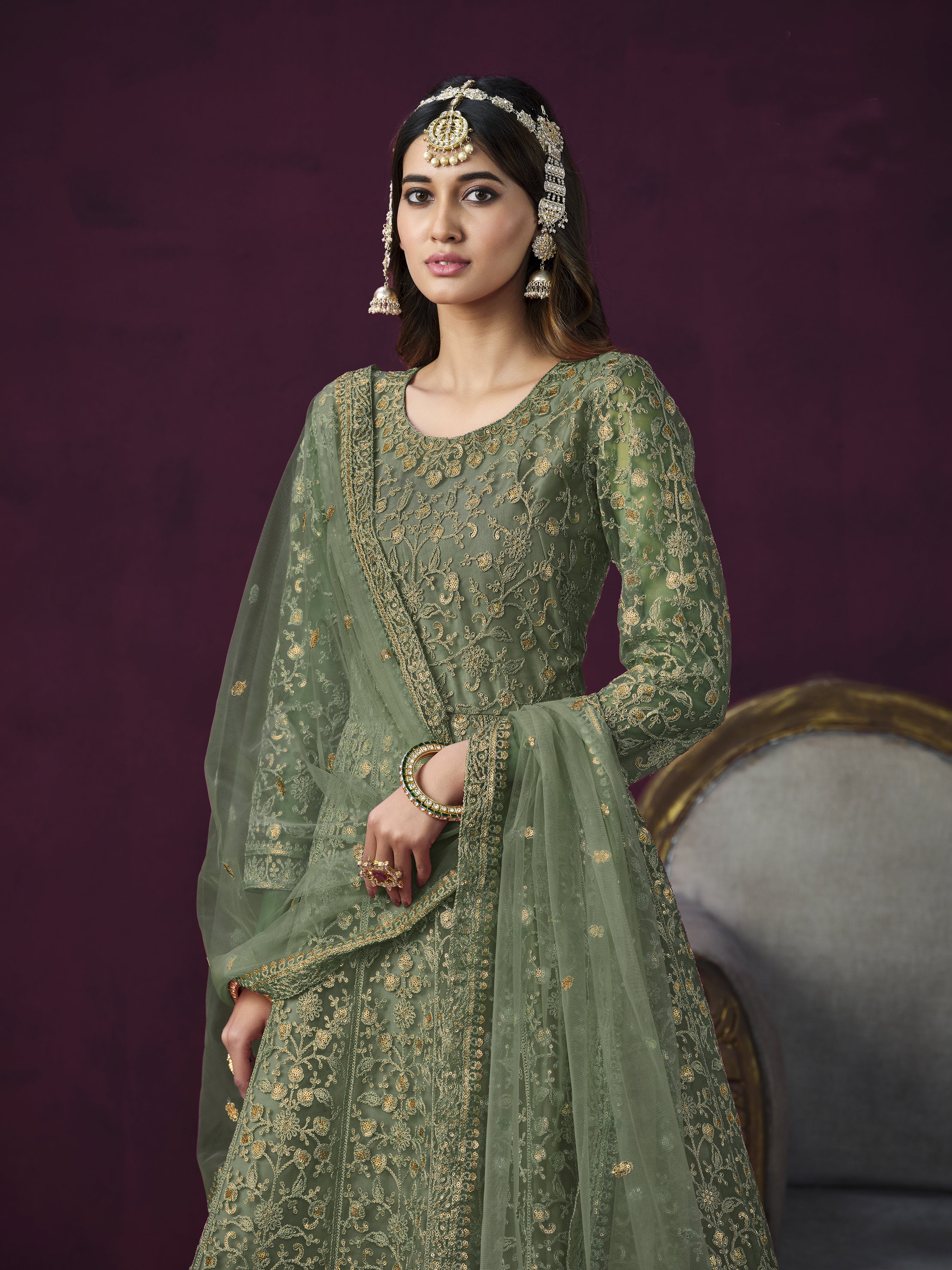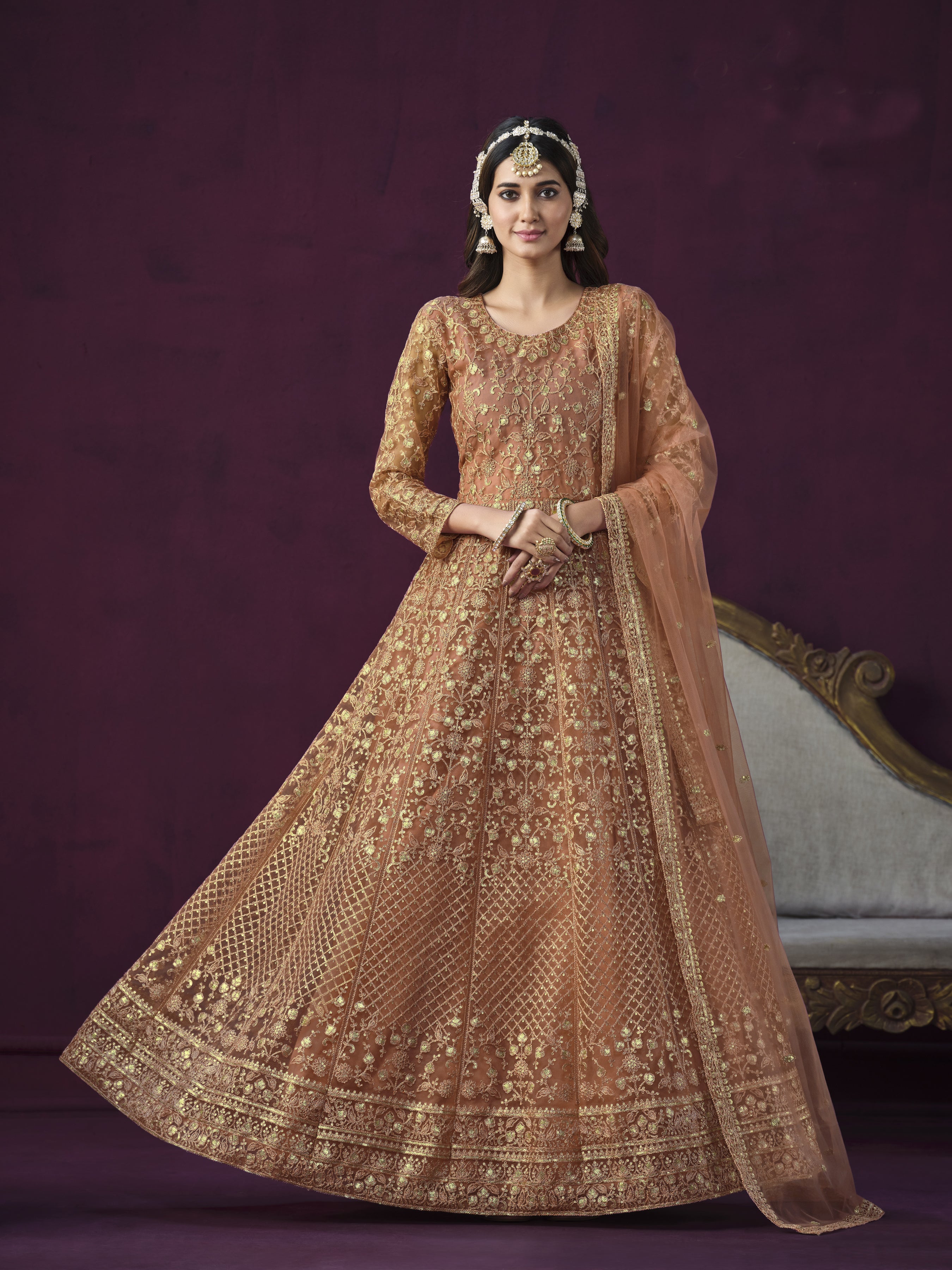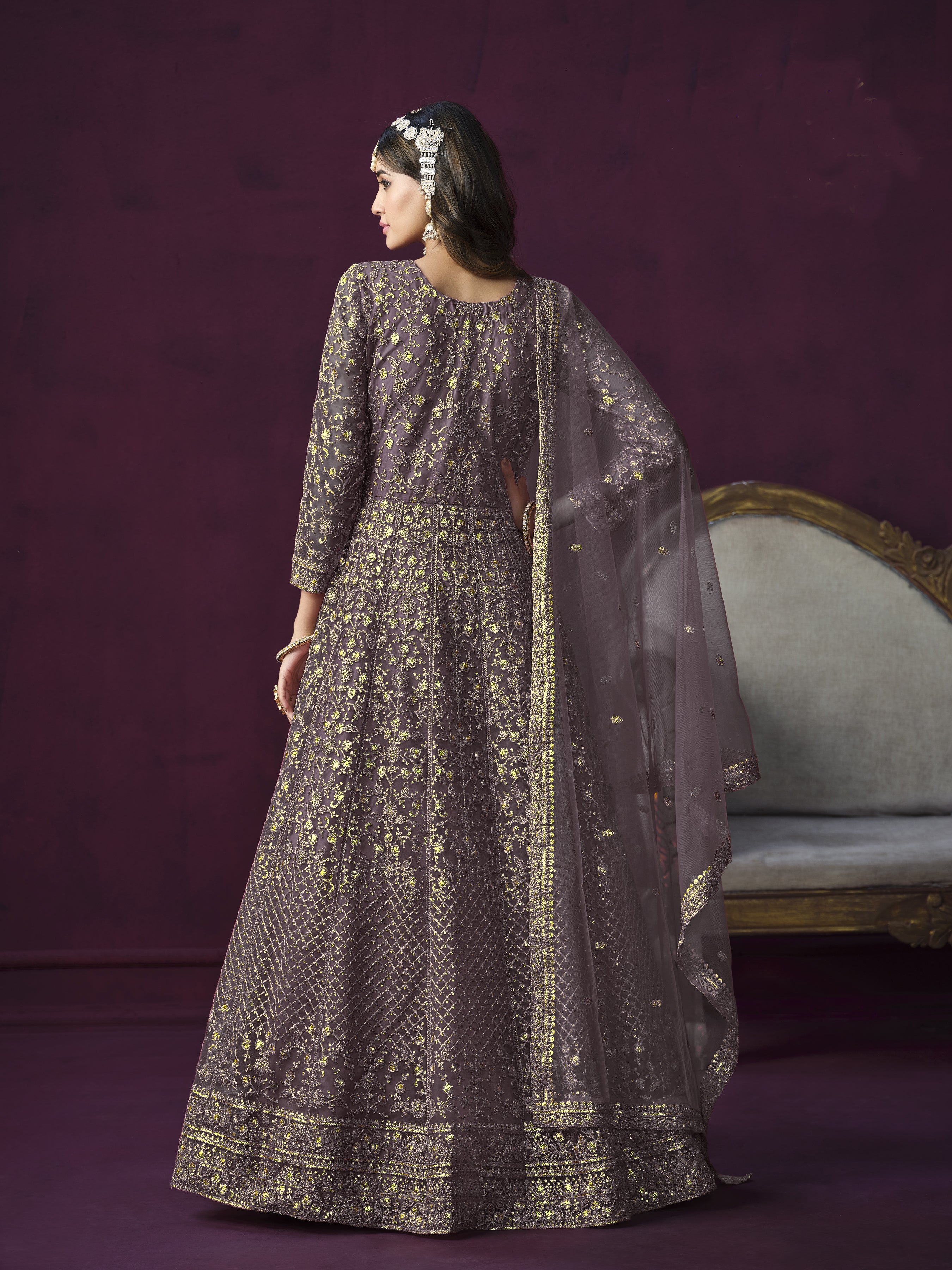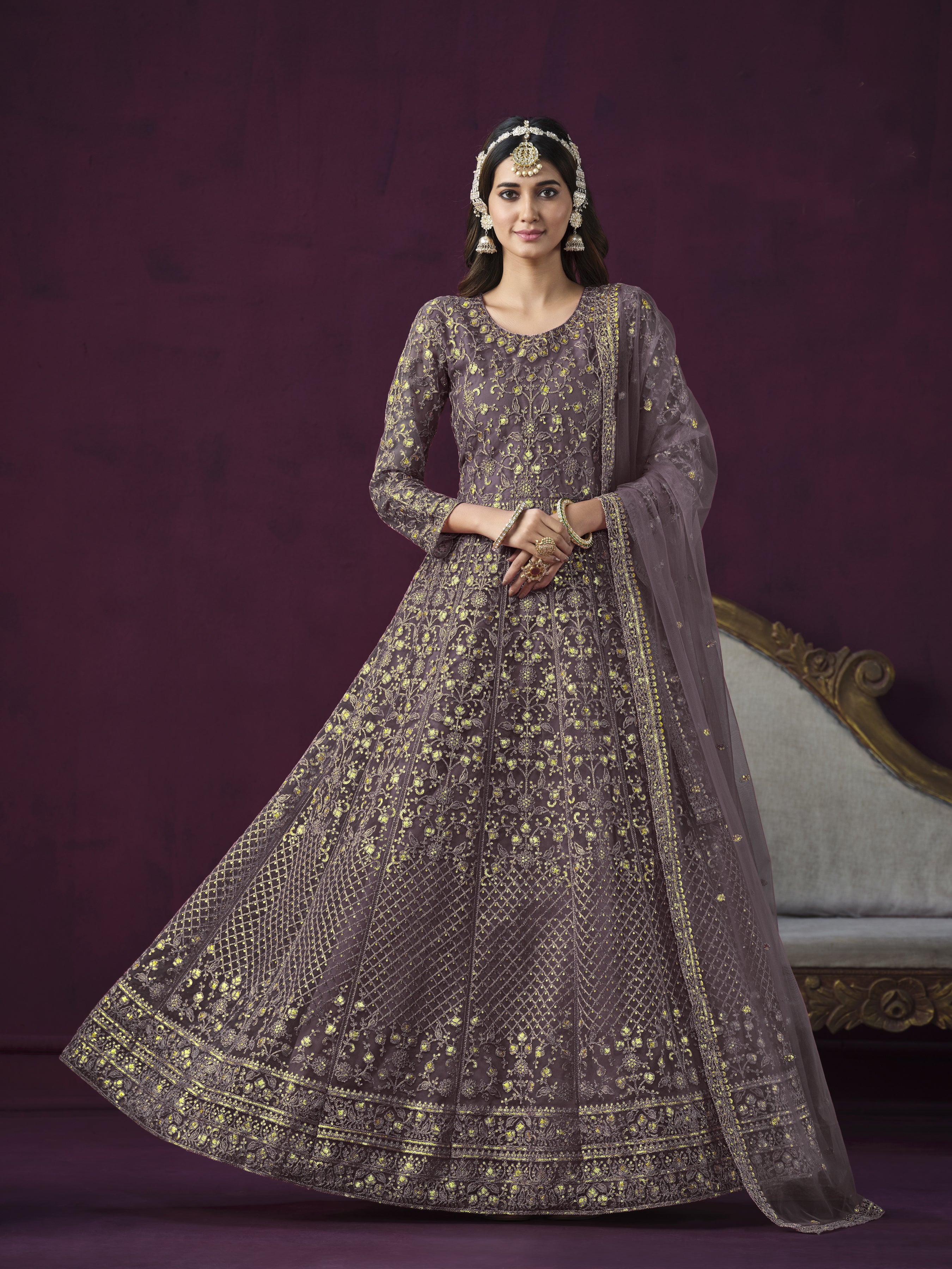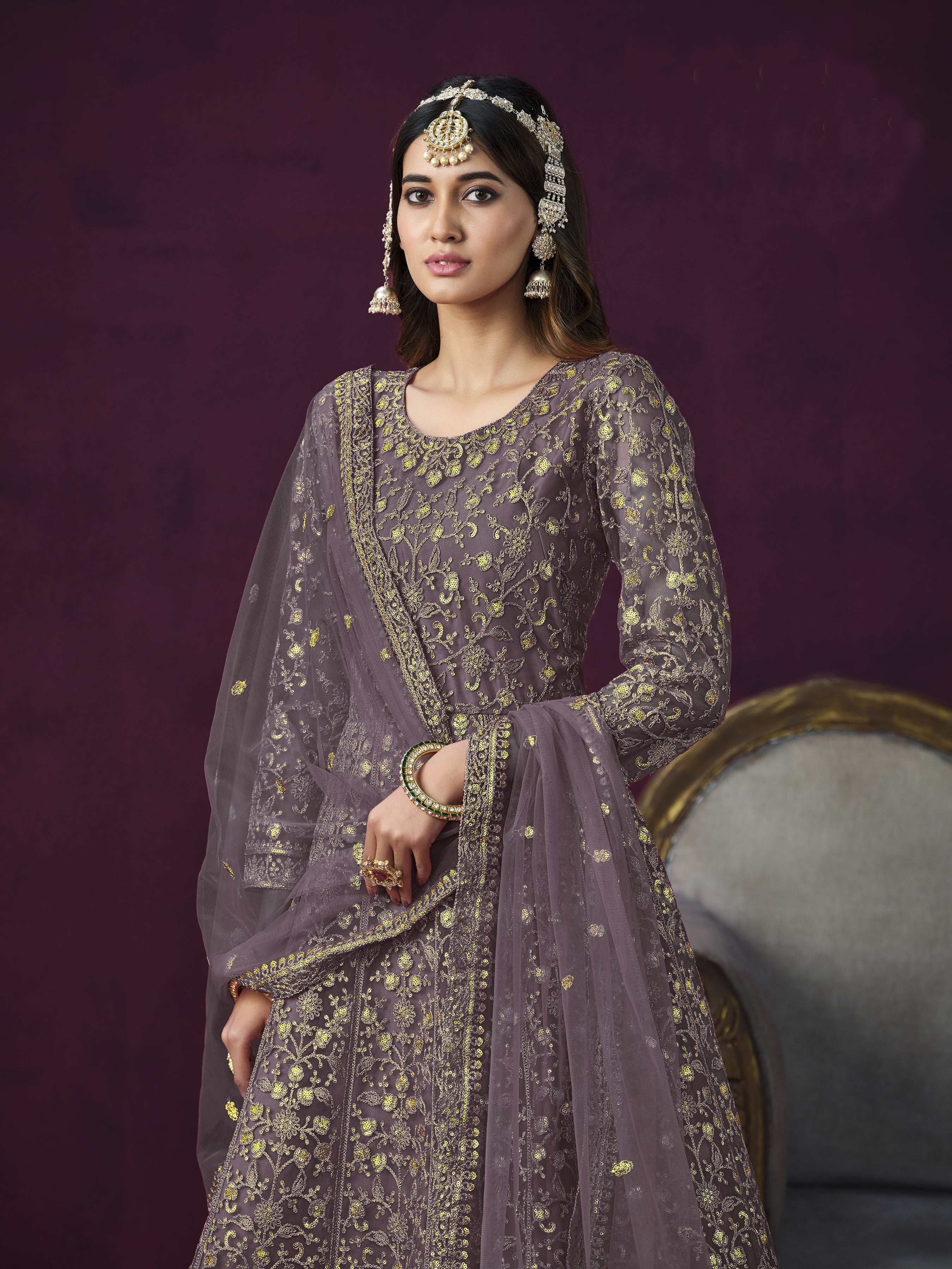 Step into elegance with this stunning mauve Anarkali set, crafted to perfection for special occasions. The outfit features a luxurious net fabric adorned with intricate golden embroidery, lending a regal charm to your look. The soft Santool fabric inner and bottom provide exceptional comfort, ensuring you stay at ease while exuding grace. Complementing the ensemble is a lightweight net dupatta, beautifully designed with matching embroidery for a cohesive and polished appearance.