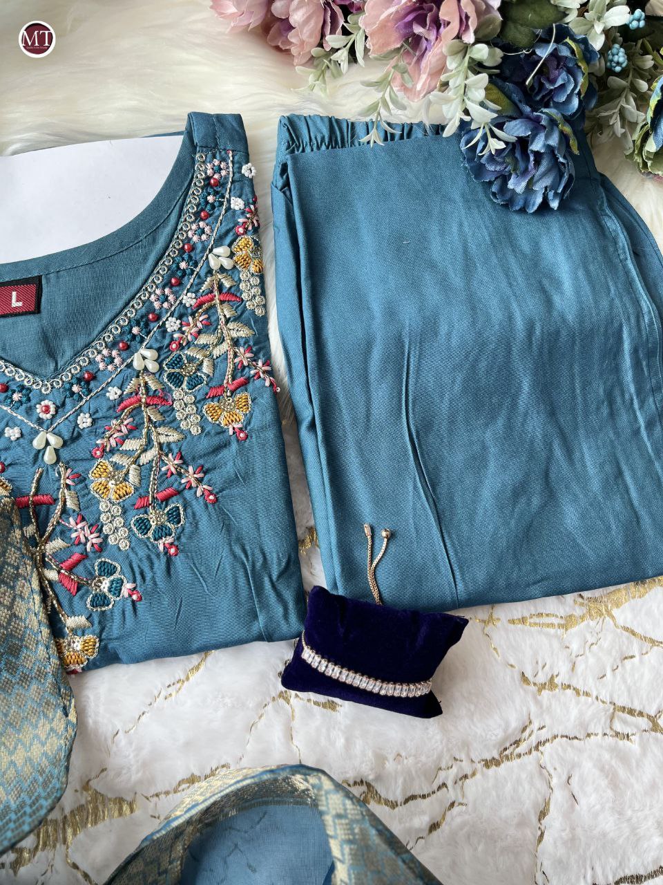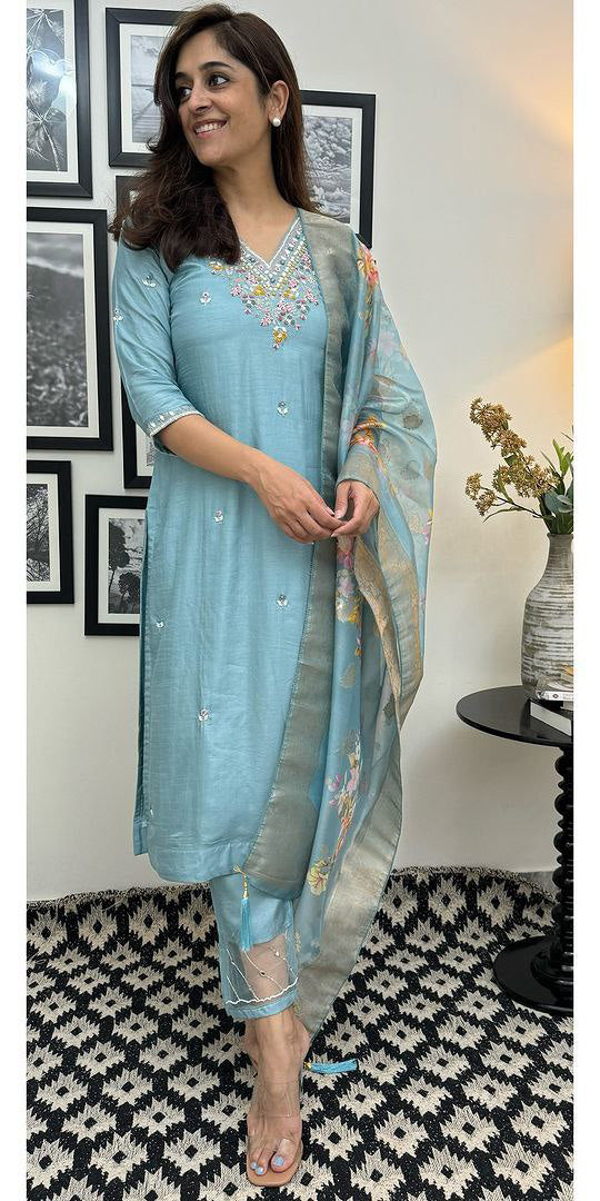 step into the world style subtle glamour with our new PREMIUM CHANDERI SILK Kurta pent Dupatta set , the Kurta has beautiful HAND WORK