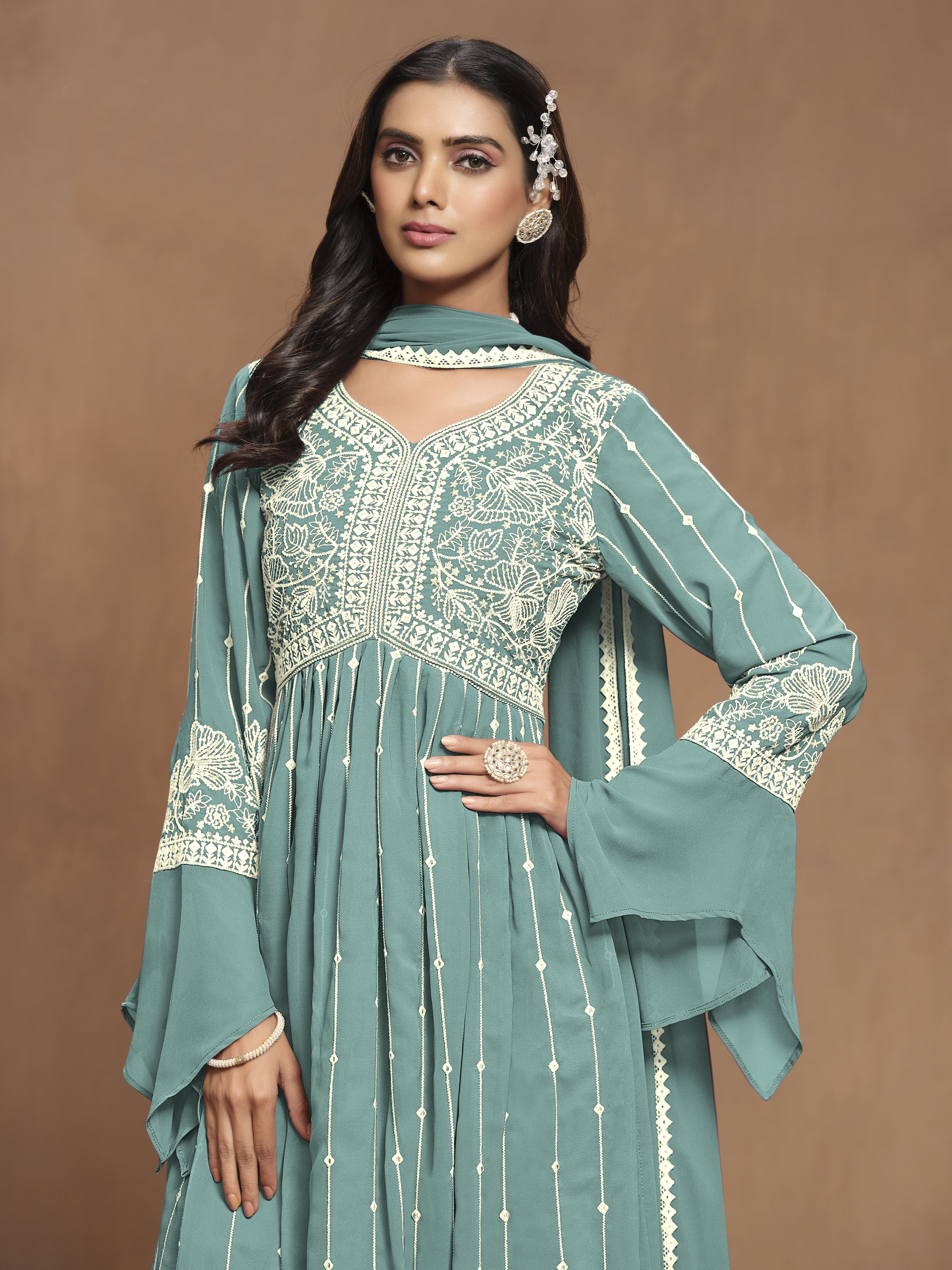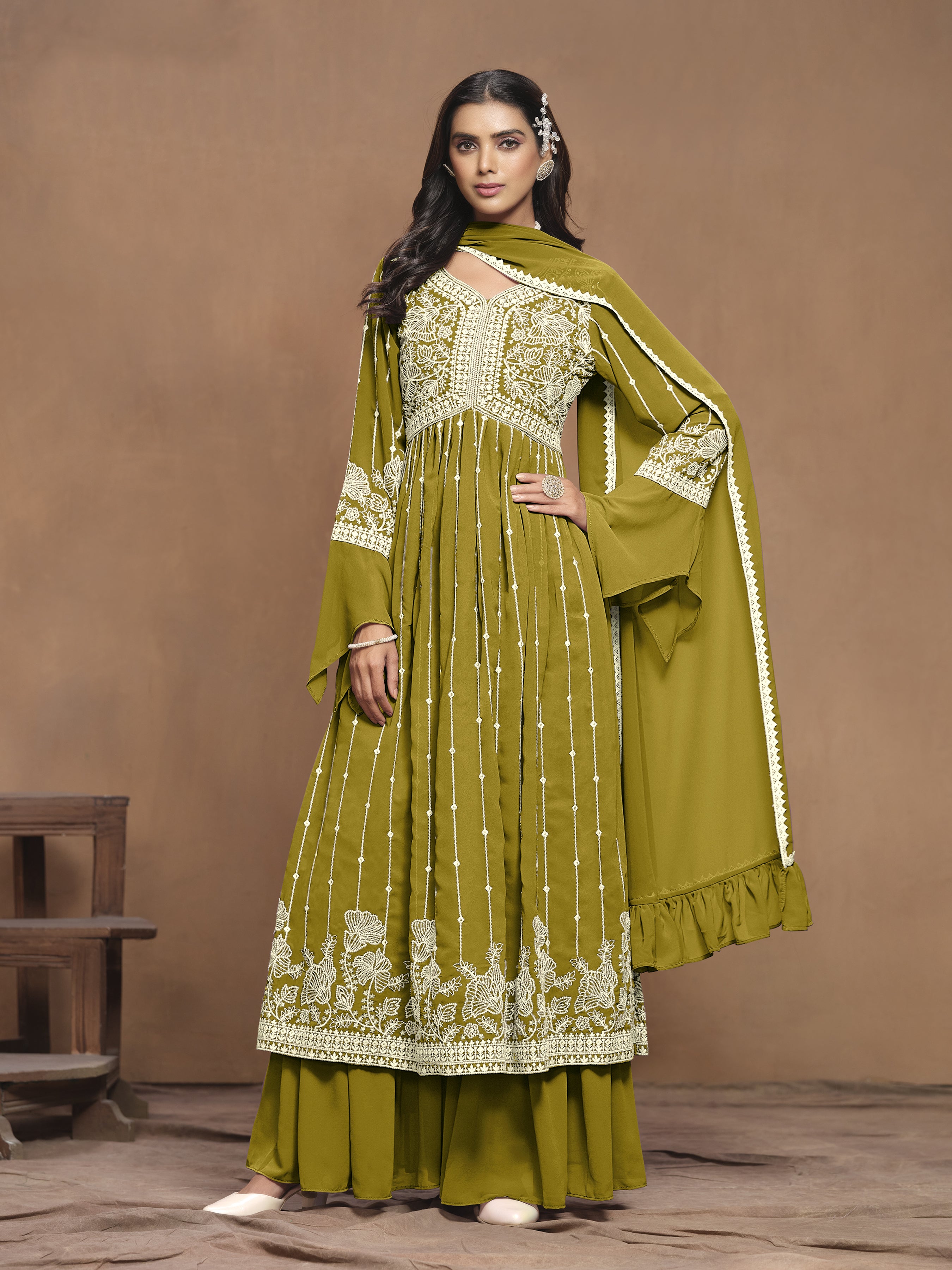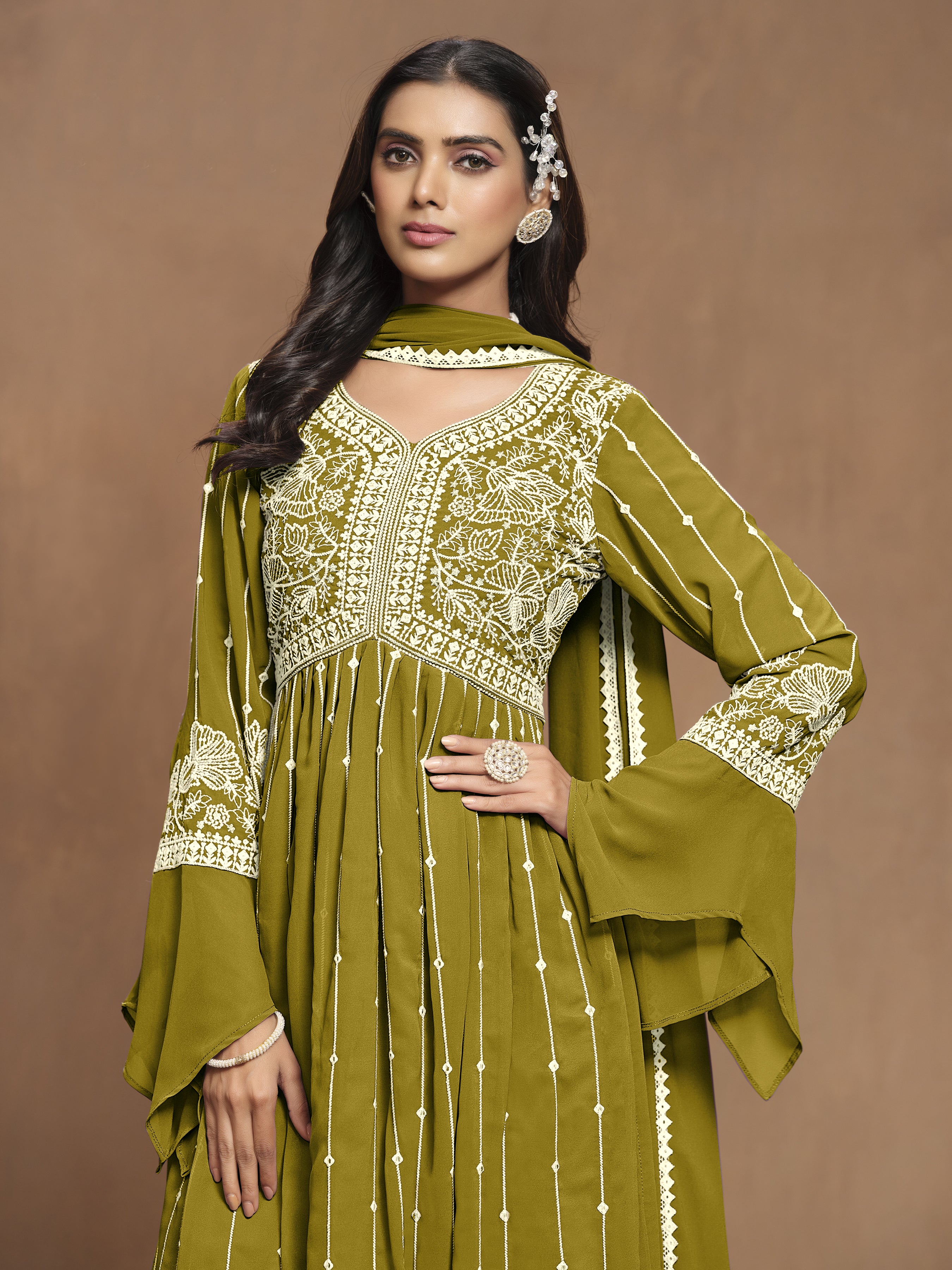 Design and trend will be on the peak of your beauty the moment you dresses this green faux georgette trendy salwar kameez. This attractive attire is displaying some remarkable embroidery done with embroidered work. Comes with matching bottom and dupatta. (Slight variation in color, fabric & work is possible. Model images are only representative.)