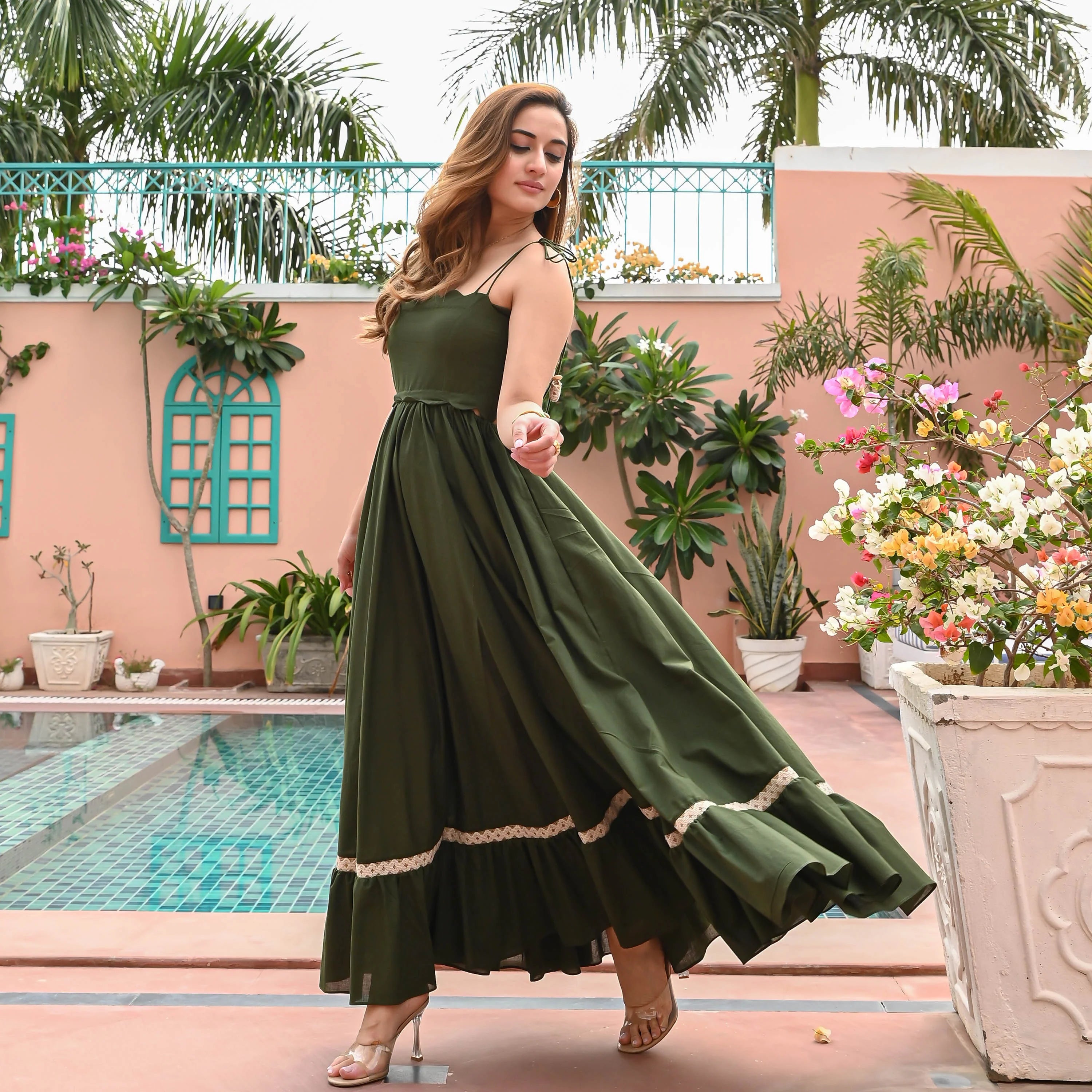Introducing the Avery Azure Cotton Dress, a captivating olive green ensemble that exudes elegance and allure. Its straight across scalloped neckline with strappy tie-ups adds a touch of sophistication, while waist cutouts offer a hint of allure. The full skirt cascades into frills with delicate lace detailing, promising to turn heads with every step. Elevate your style with this enchanting garment.