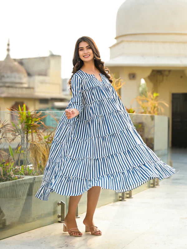 Dress. Made with comfort and breathability in mind, this fashionable piece features tiered layers and a classic navy stripe pattern. Perfect for any occasion, this dress will leave you feeling confident and stylish.