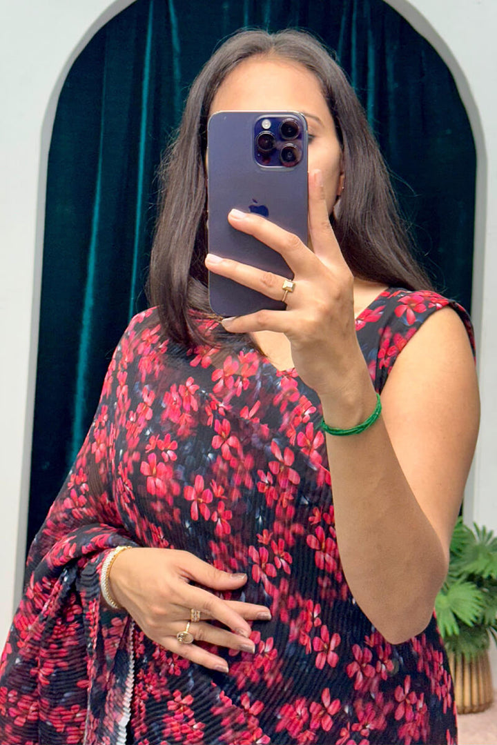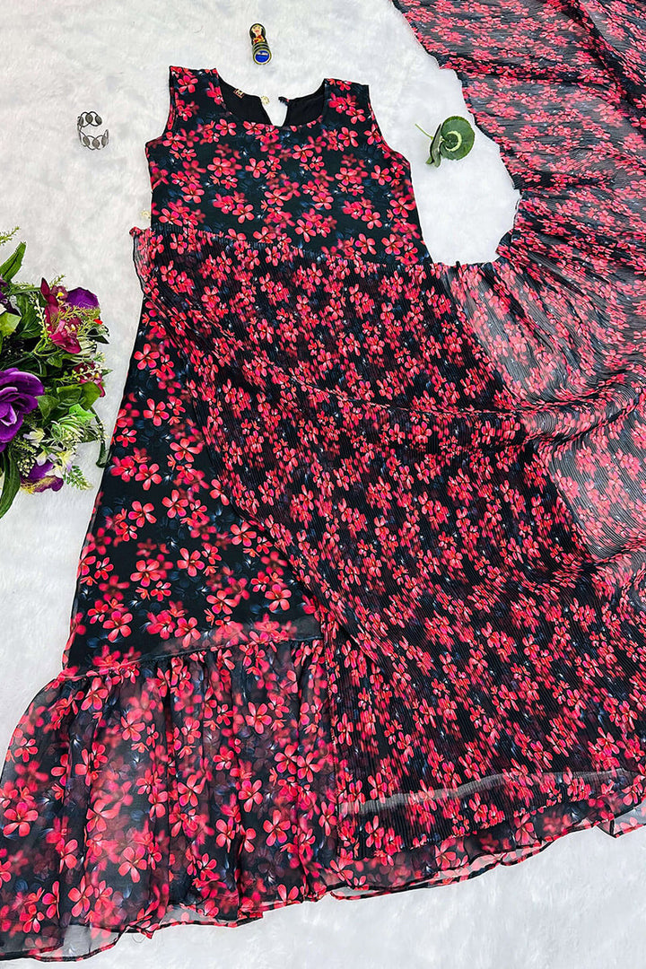 SAREE SPECIFICATIONS: This stunning Minute Ready To Wear Georgette Gown Saree features a beautiful floral red print...