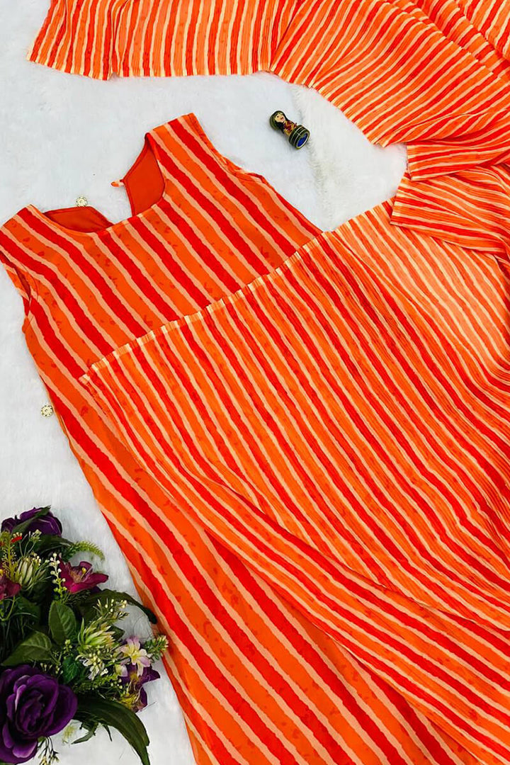 This stunning Minute Ready To Wear Georgette Gown Saree features a beautiful floral red print and a 2 meter ruffle for added flair. The stitched saree is made with high-quality Georgette fabric, and comes with a micro cotton inner lining for added comfort. Perfect for any occasion, this saree is easy to wear and easy to care for with its dry clean only instructions.