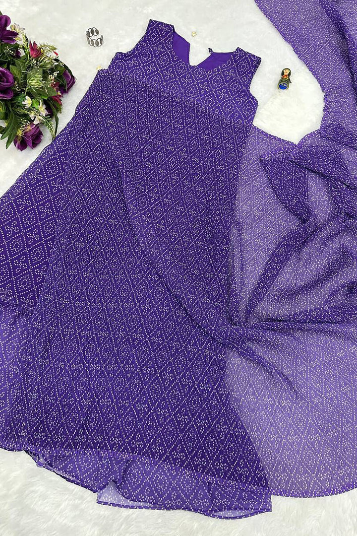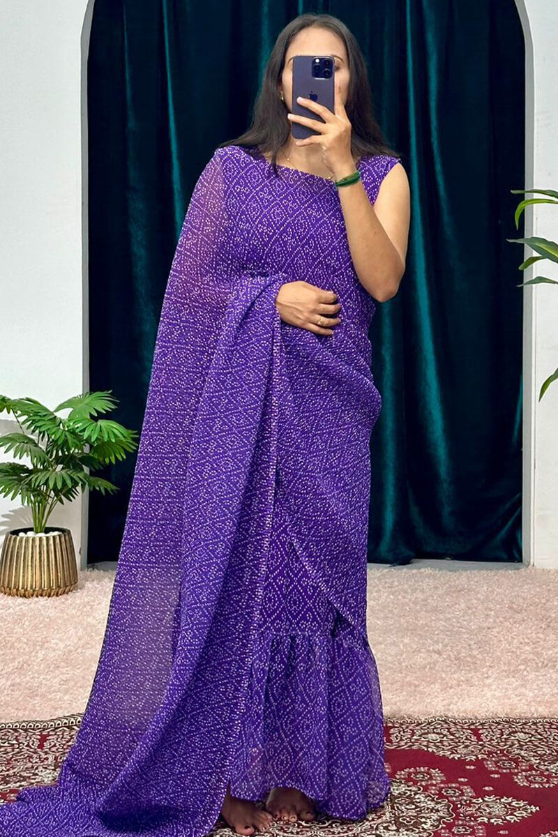 1-Minute Ready To Wear Georgette Gown Saree with purple bandhni print