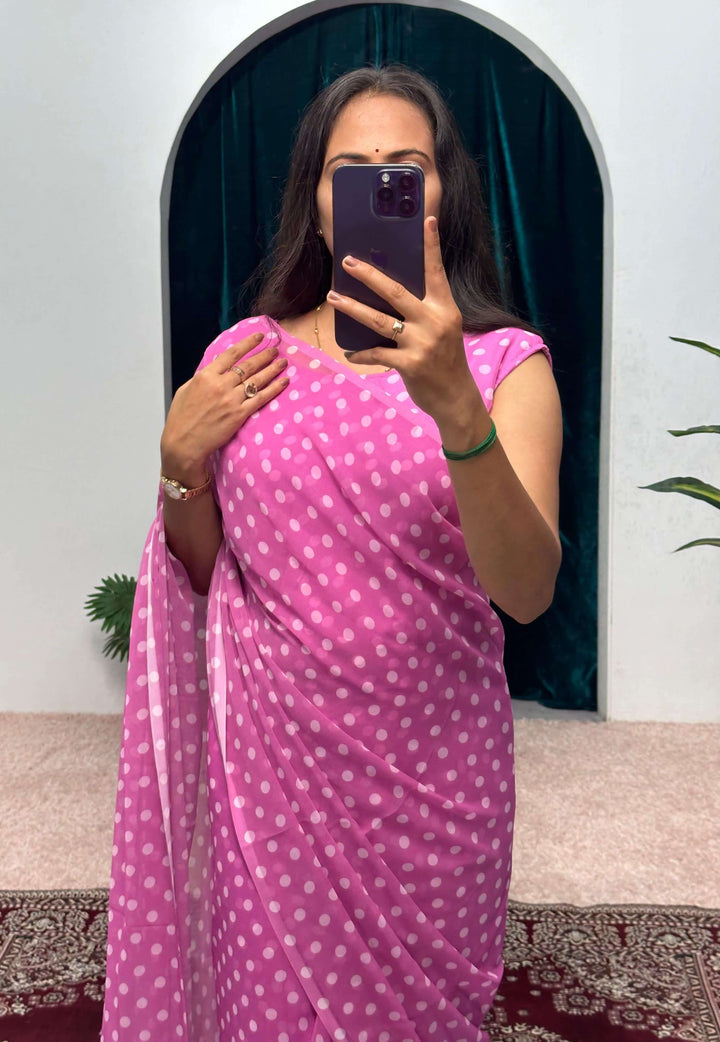 1-Minute Ready To Wear Georgette Gown Saree with white dots in pink print