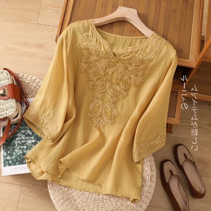 This elegant woman's yellow blouse, displayed gracefully on a chair, exudes a vibrant charm that is perfect for any wardrobe. Crafted from high-quality fabric, it offers both comfort and style, making it an ideal choice for casual outings or professional settings. The bright yellow hue adds a touch of sunshine to your ensemble, while the blouse's tailored design ensures a flattering fit. Elevate your fashion collection with this versatile piece that effortlessly combines sophistication and a cheerful aesthetic.
