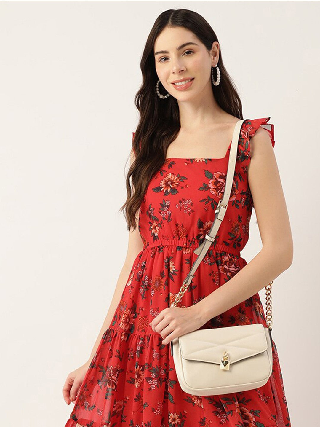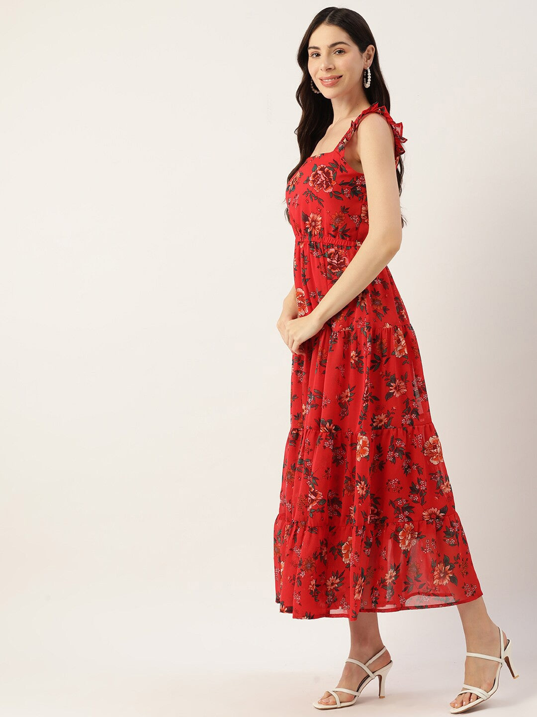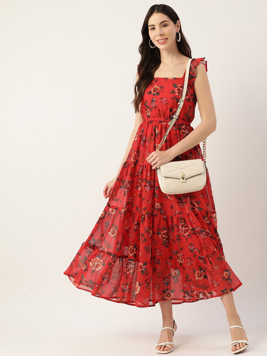 The product features a Fit and Flare shape with a Square Neckline, a Midi length, and a Floral print or pattern. The dress has a Sleeveless design and No Sleeves styling, making it perfect for casual occasions. It is expertly crafted with Woven fabric, ensuring both comfort and style.