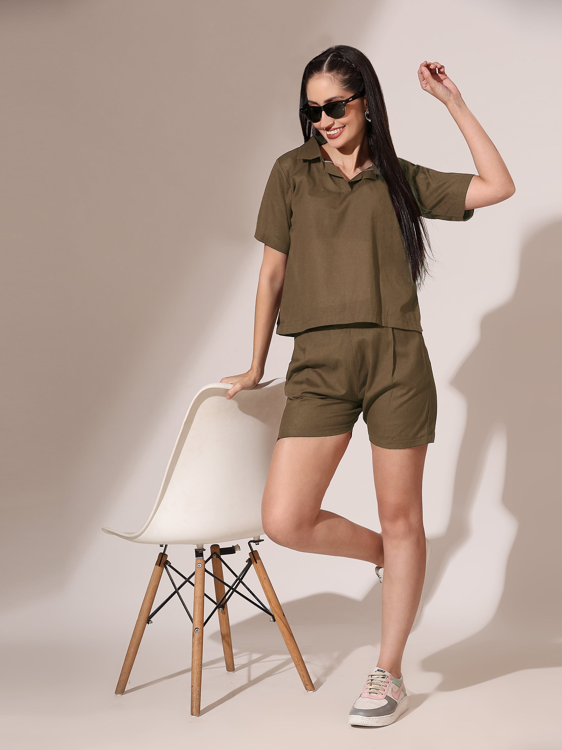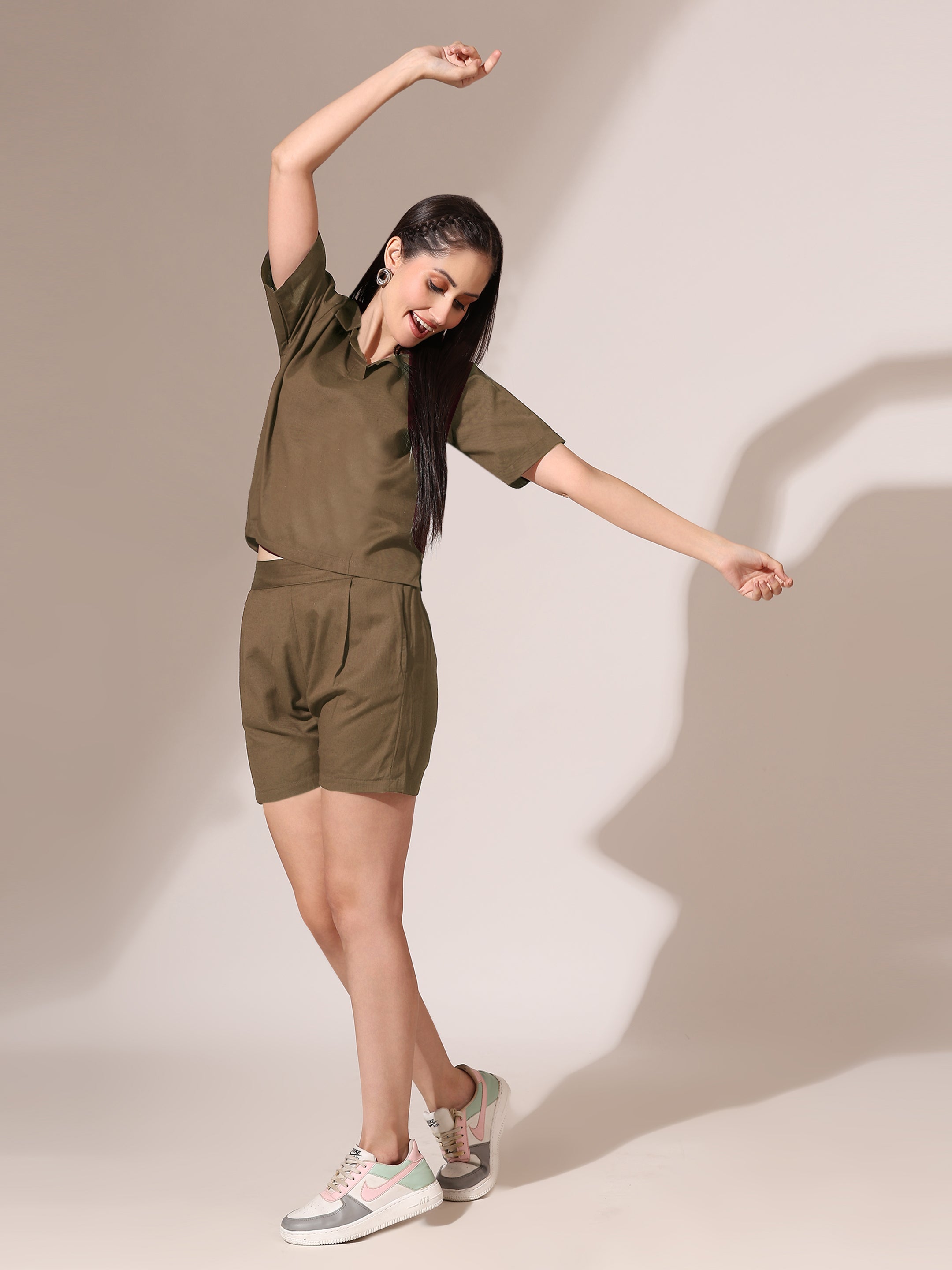 Slay in style with our Sage Brown Shorts and Top combo! Crafted from high-quality cotton hand-loomed fabric, this ensemble is a perfect blend of comfort and chic. The top features a trendy polo neck and playful half sleeves, while the shorts boast a clinched waist and two side pockets for added convenience. With their straight silhouette and versatile sage brown hue, this combo is ready to take your fashion game to the next level. Get ready to rock the scene and unleash your inner fashionista with Sage Brown!