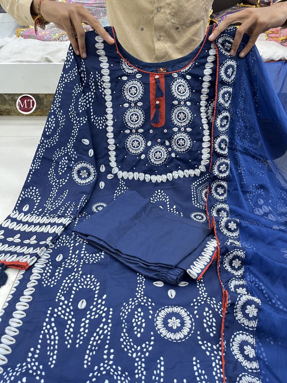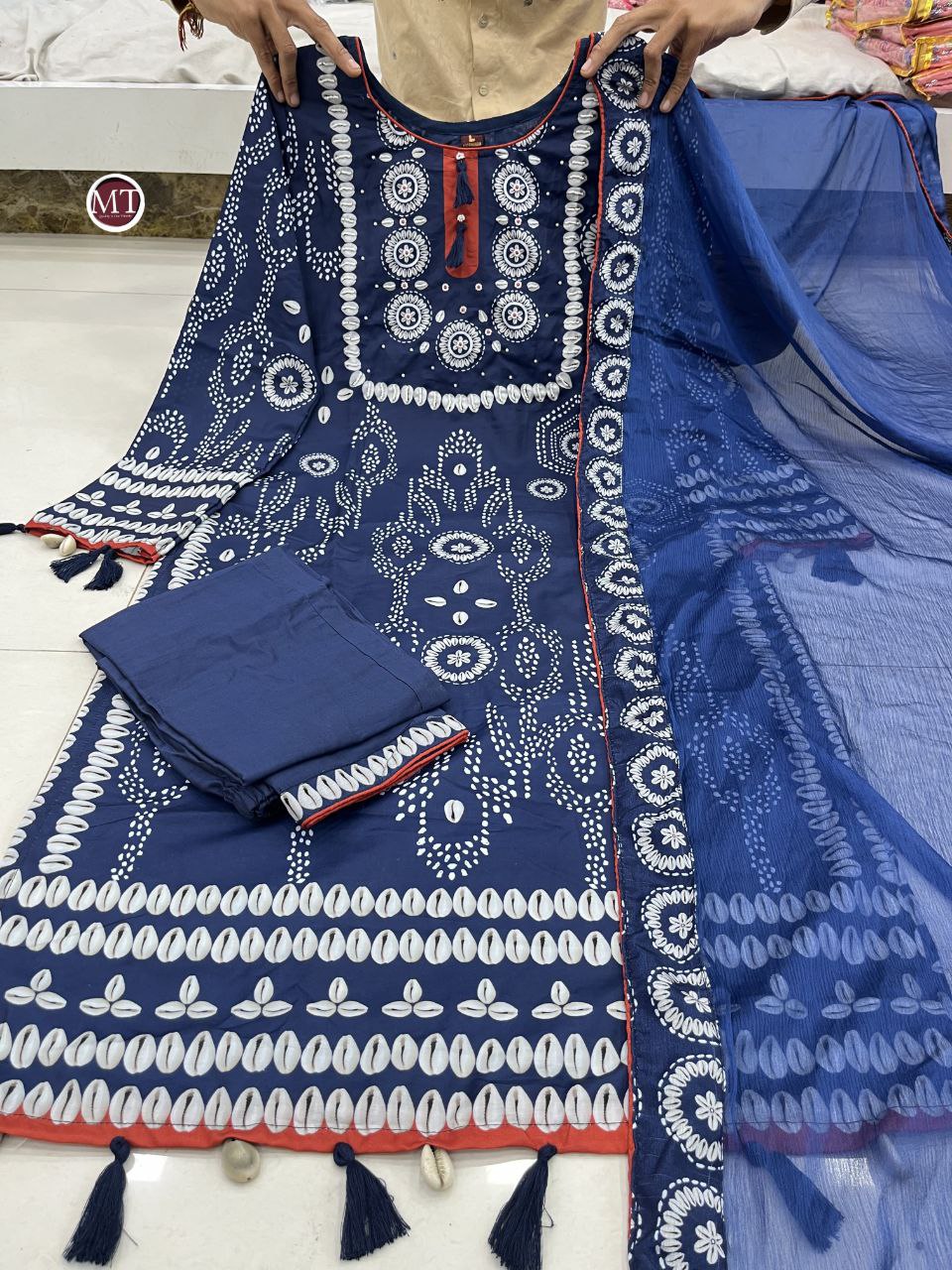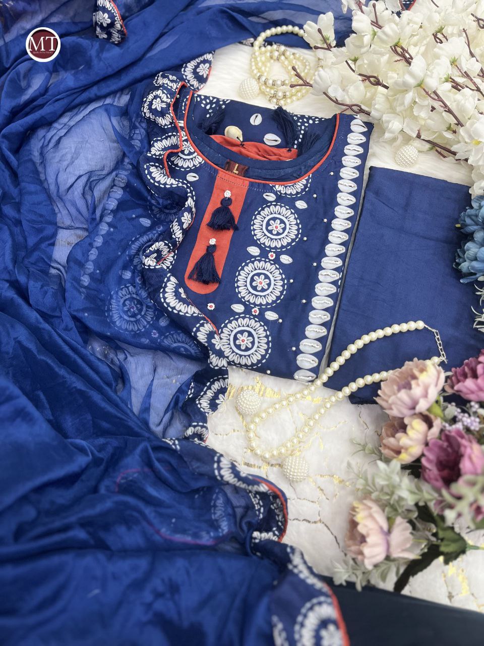 Wrap yourself in elegance this festive with our NAVY BLUE/RED READYMADE Suit , featuring intricate Schiffli HAND WORKS and thread kodi and latkan. Perfect for celebrating the bond of love. A blend of tradition and modernity, just like the bond you share.