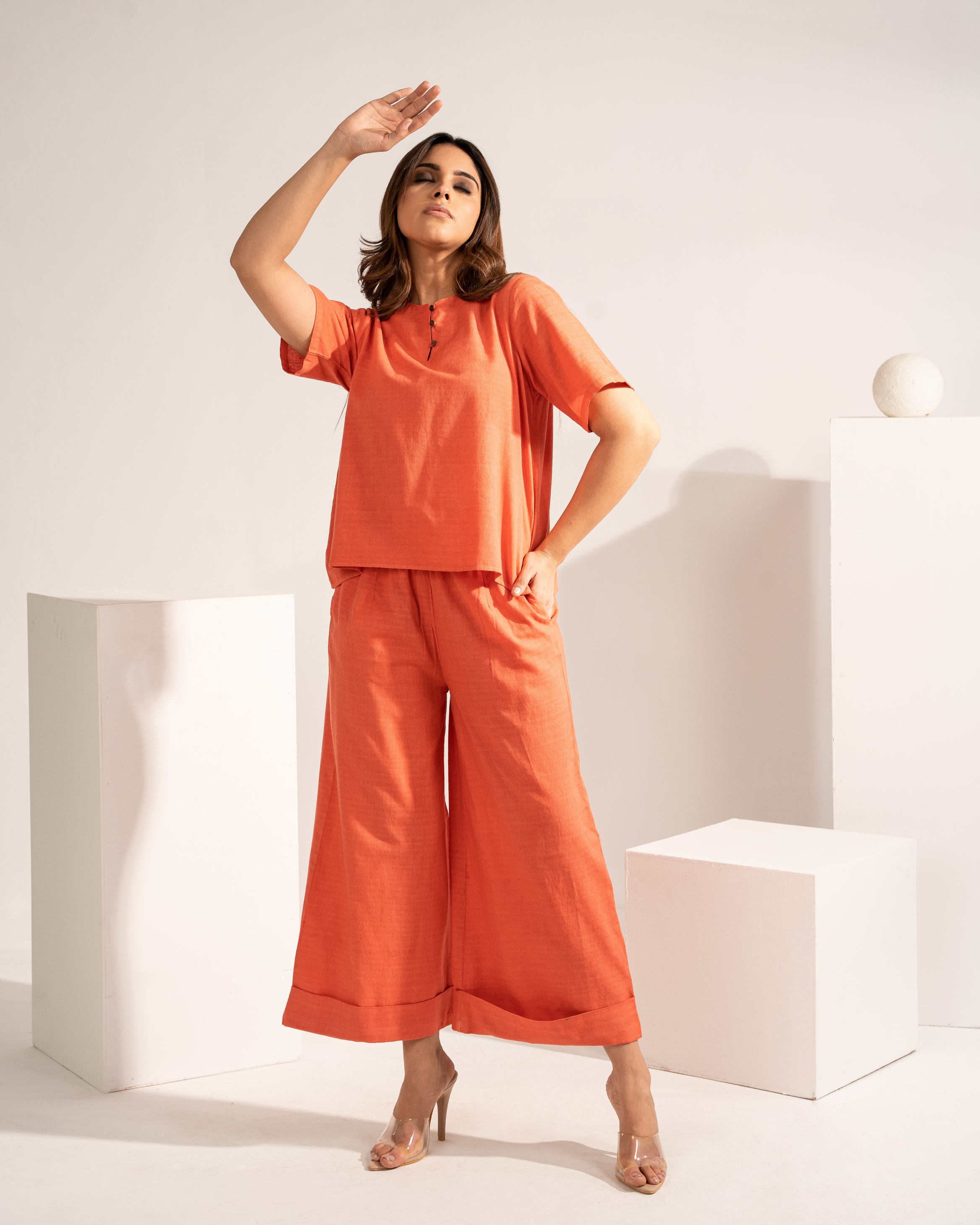 Orange Top , has a shirt collar, relaxed fit, has short sleeves
