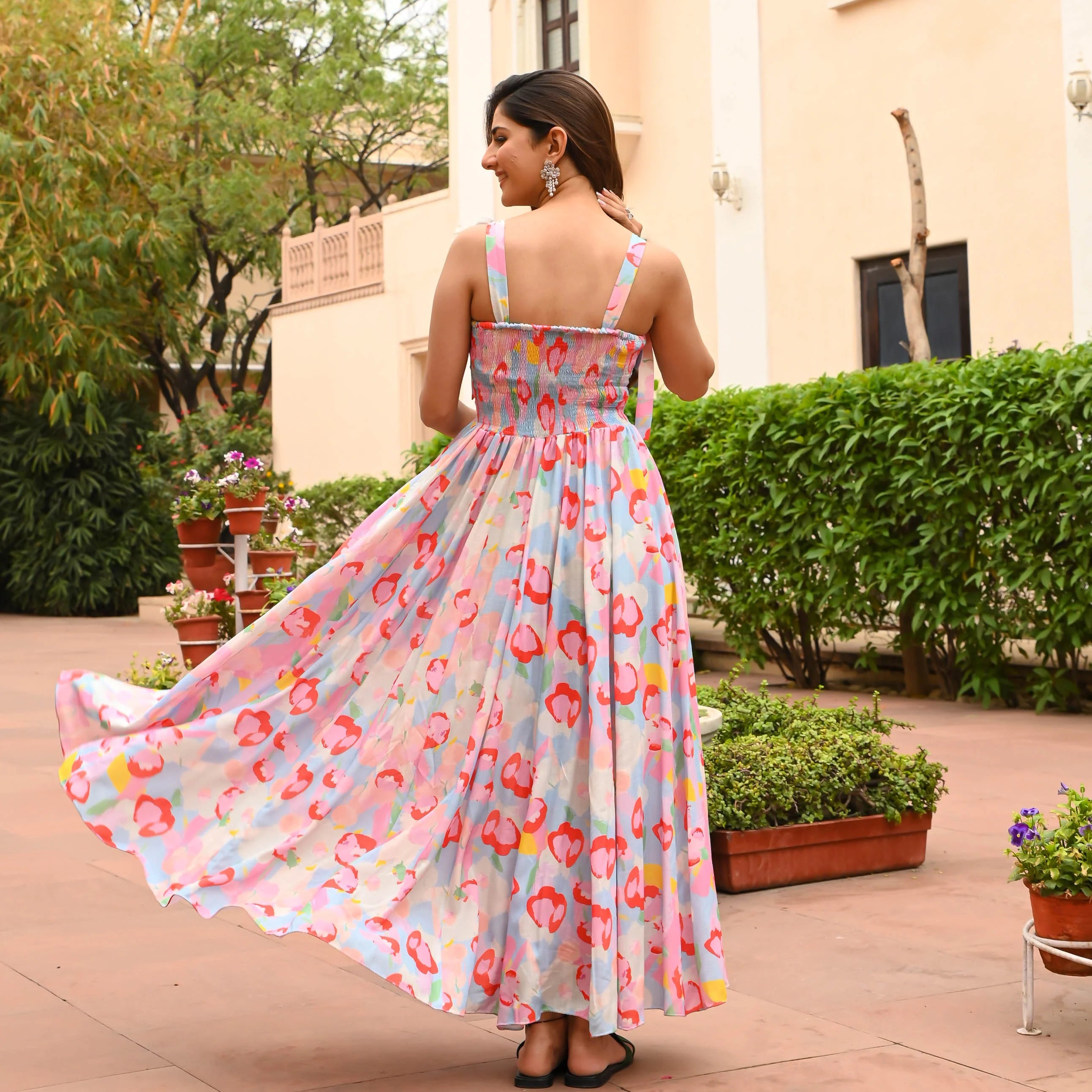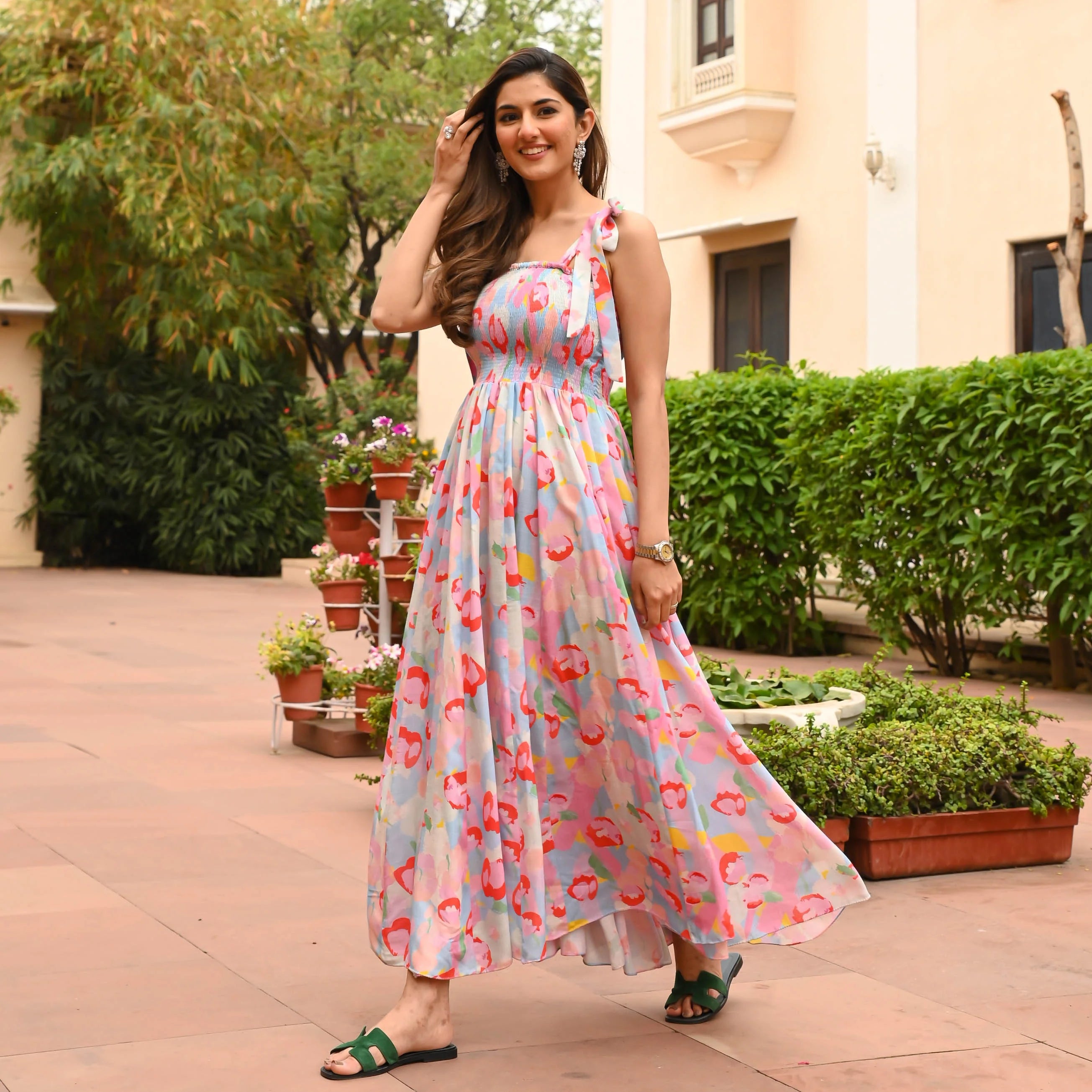 Introducing our Summer Breeze Viscose Dress, the perfect addition to your summer wardrobe. The bodice features intricate shirring detailing, which not only looks elegant but also adds a comfortable stretch to the dress. The unique multicolour print is eye-catching and vibrant, with hues of pink, red, yellow and blue that will brighten up any room. The lightweight and flowy fabric of the dress and tie-up straps will keep you cool and comfortable, making it perfect for hot summer days. Whether you're attending brunch with friends or a casual outing, this Dress is sure to impress.